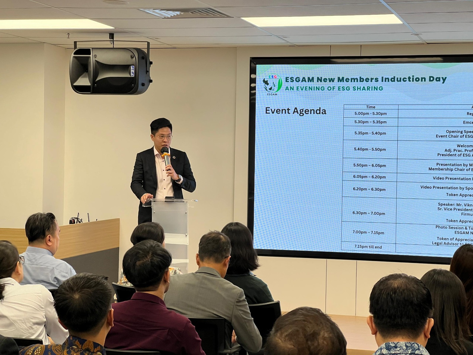 Highlights of the evening include introductions of the new ESGAM members. Through a series of video presentations, new corporate members, including Supersafe Industries Sdn Bhd, Manulife Malaysia, AVM Cloud Sdn Bhd, Eutech Cybernetics (Malaysia) Sdn Bhd, IRIS Corporation Berhad, I-Chem Solution Asia Sdn Bhd and Complete Human Network Sdn Bhd showcased their work, values, and motivations for joining ESGAM. New individual members, Mr Bernard Lam Wai Loon and Mr David Lee also had the opportunity to share their background, motivations for joining ESGAM and their expectations from the organization.